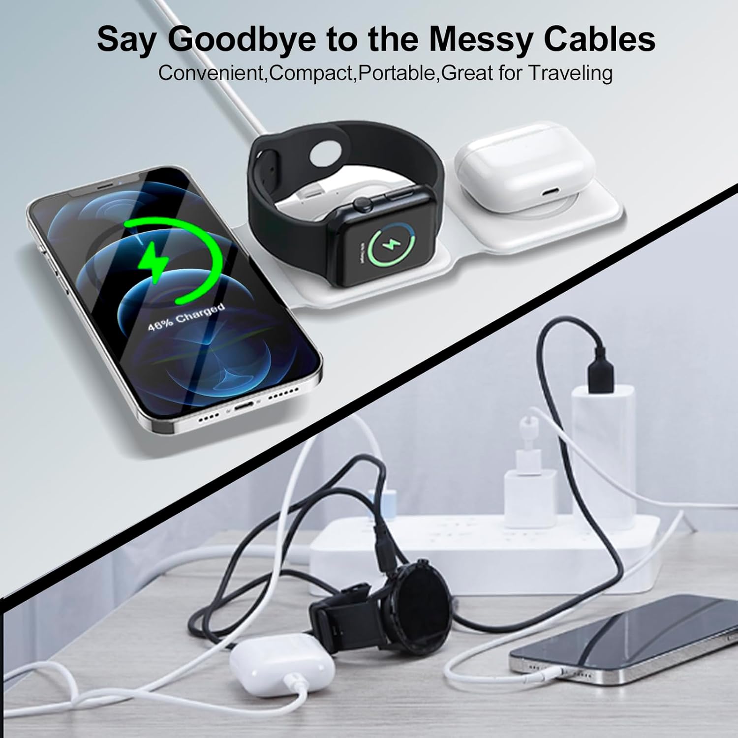 Travel Essentials Foldable Charger:The travel charger for multiple devices features a foldable design that allows you to charge your Phone, iWatch and AirPods at the same time. The lightweight and compact design is easy to organize and carry. It allows you to say goodbye to tangled cords and messy cables and keep your space neat and organized, bringing great convenience and ease to your life.
