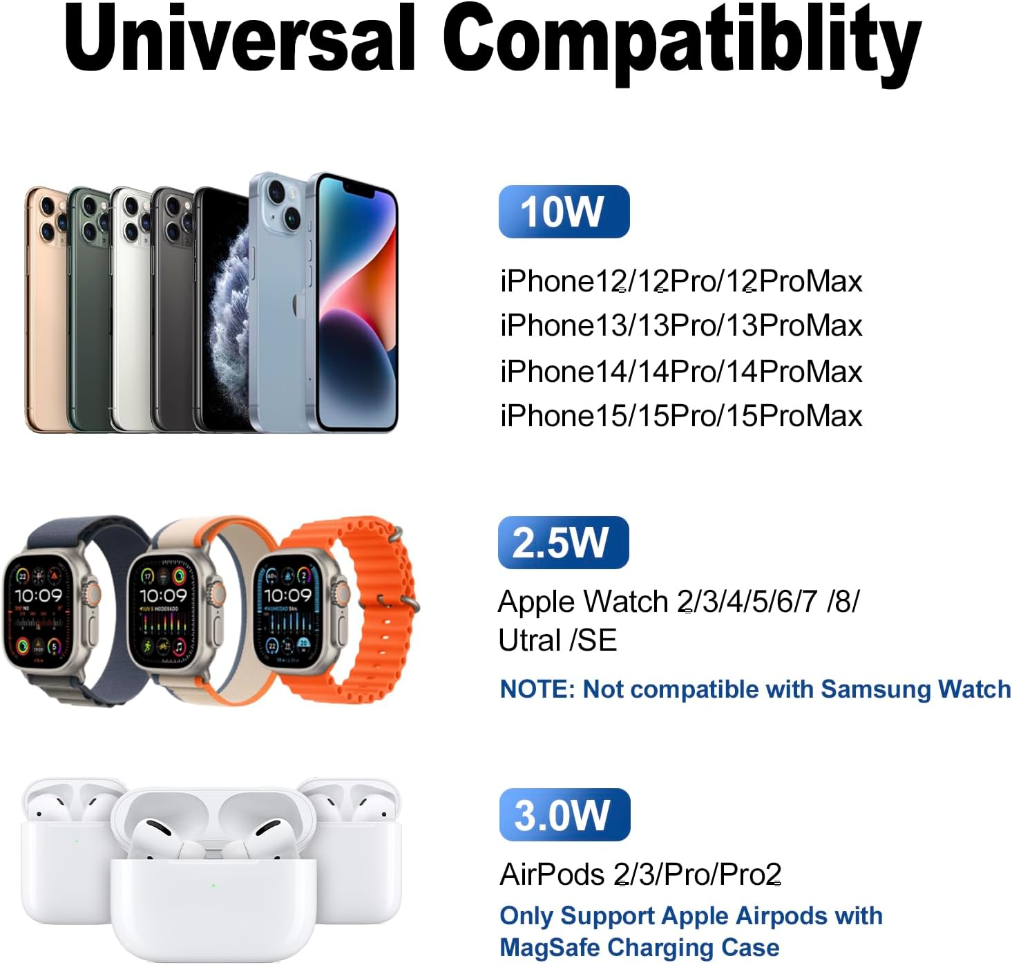 3-IN-1 Wireless Charging Station:The 3-in-1 charger can efficiently charge 3 devices at the same time, up to 15W iPhone, 3W AirPods and 2.5W iWatch. The wireless charger is compatible with AirPods 2/3/Pro/Pro2; iPhone 15/14/13/12 series; iWatch Ultra/8/7/SE/6/5/4/3/2.