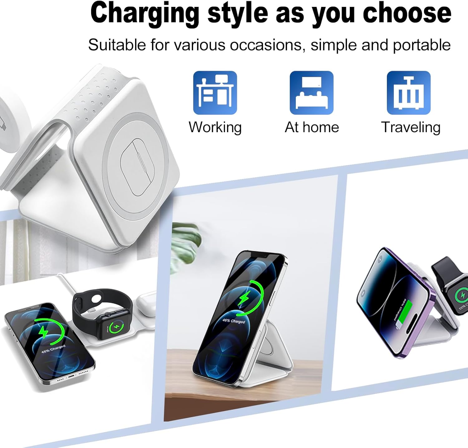 Foldable Magnetic Charger:The 180° foldable wireless charging station is designed with a strong magnetic “external magnetic wing” holder, which can be folded into a sturdy wireless charger stand and supports three folding charging modes. It can also be used as a phone stand, allowing you to adjust it horizontally or vertically for watching movies and chatting.