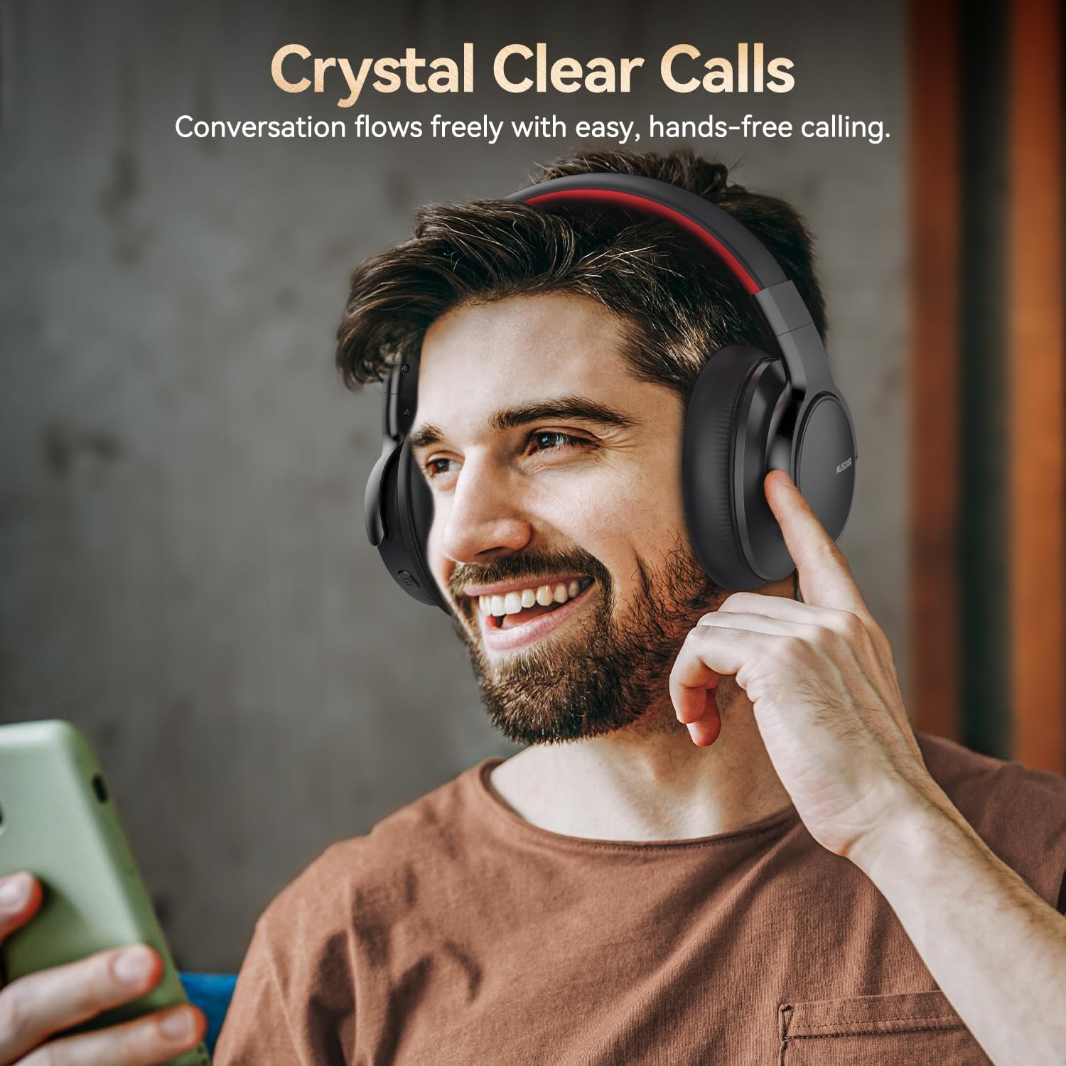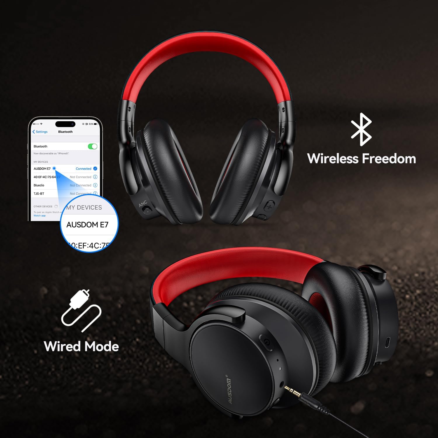 AUSDOM E7 Active Noise Cancelling Headphones: Wireless Bluetooth ANC Over Ear Headphone with Deep Bass, Microphone, 50H Playtime, Hi-Fi Audio, 3.5mm Jack, Fast Charging for Travel/Work (Black Red)