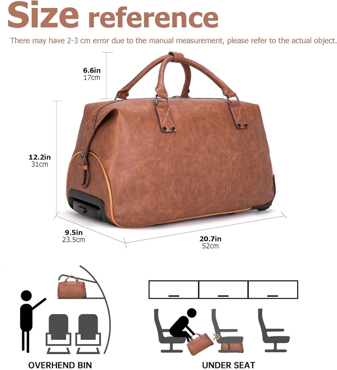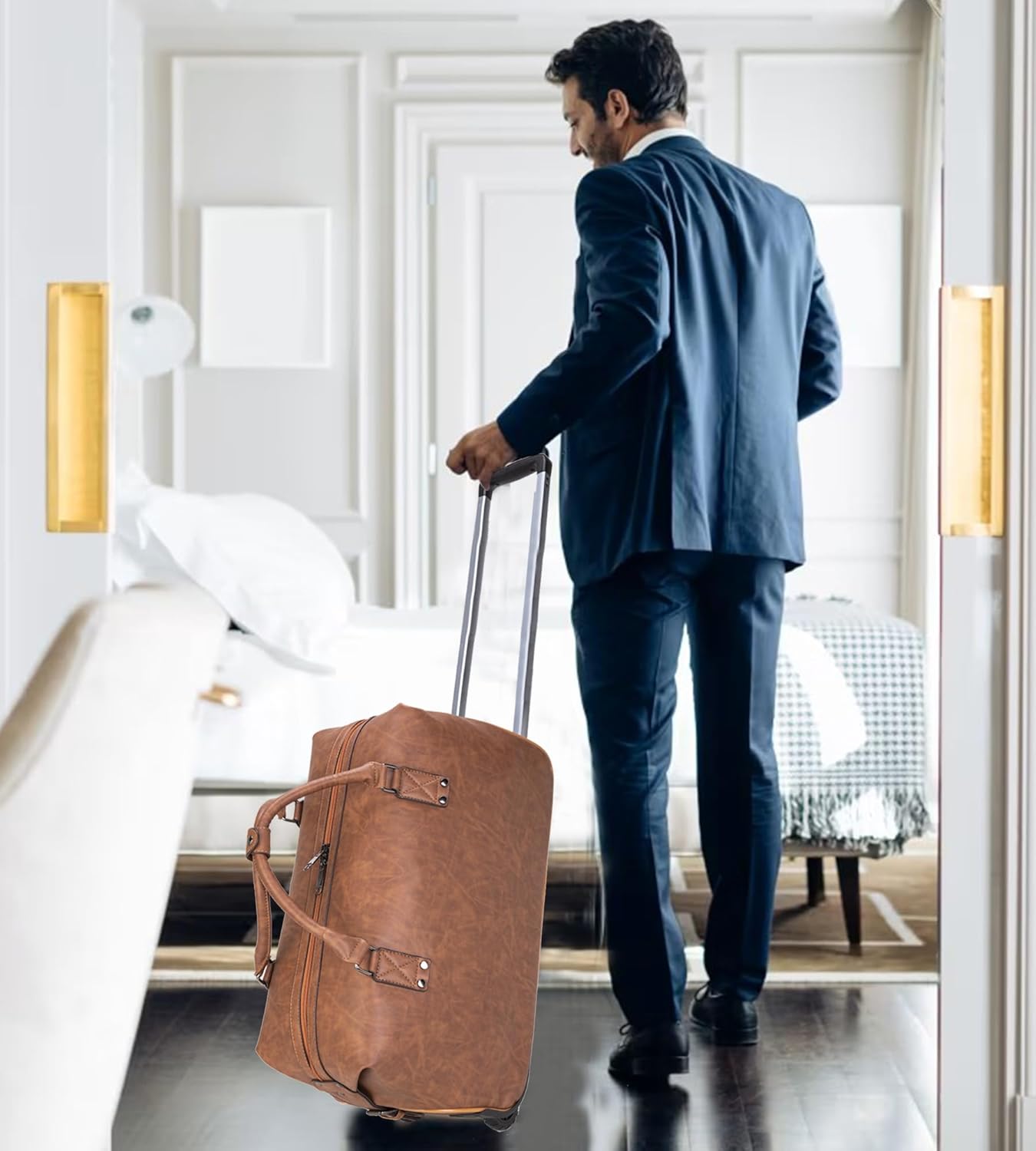 feilario Travel Duffel Bag with Wheels Leather Unisex Weekender Bags Waterproof Toiletry Bag Convenient Carry on Suitcase for Overnight Trip (Brown)
