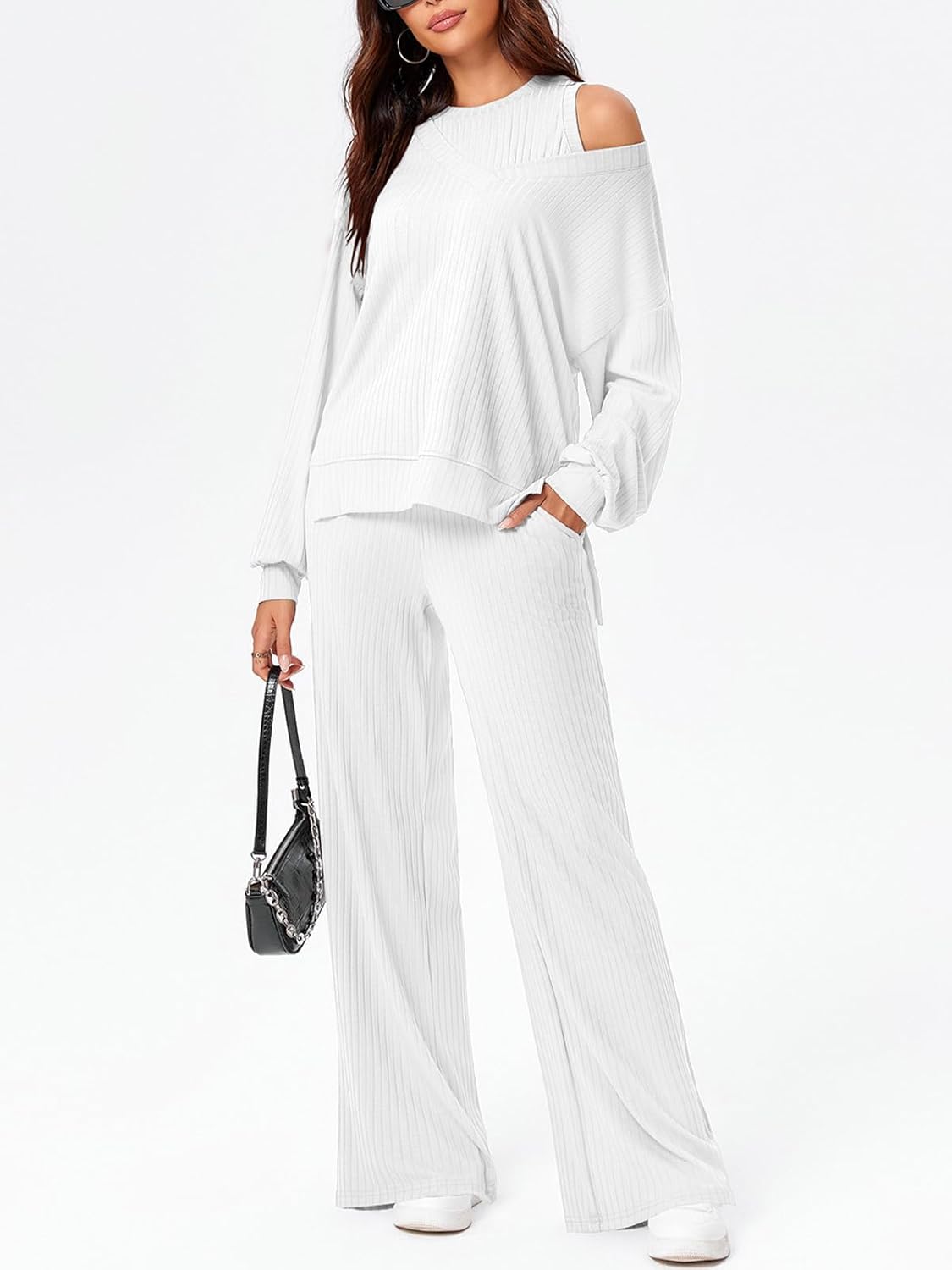 Imily Bela Womens Lounge Sets Tank Top and Off the Shoulder Long Sleeve Tops Wide Leg Pants Casual 3 Piece Outfits Tracksuit
