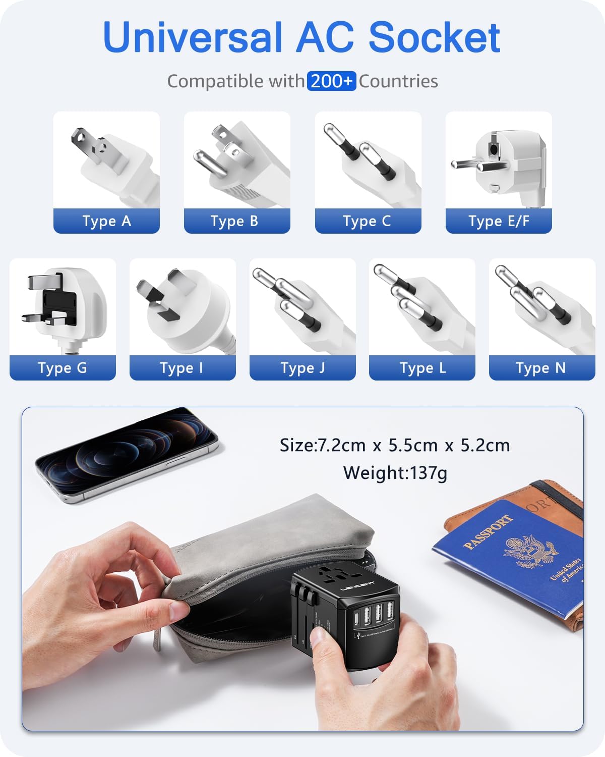 LENCENT Universal Travel Adapter, International Charger with 3 USB Ports and Type-C PD Fast Charging Adaptor for iPhone, Samsung, Tablet, Gopro. for Over 200 Countries Type A/C/G/I (USA, UK, EU AUS)