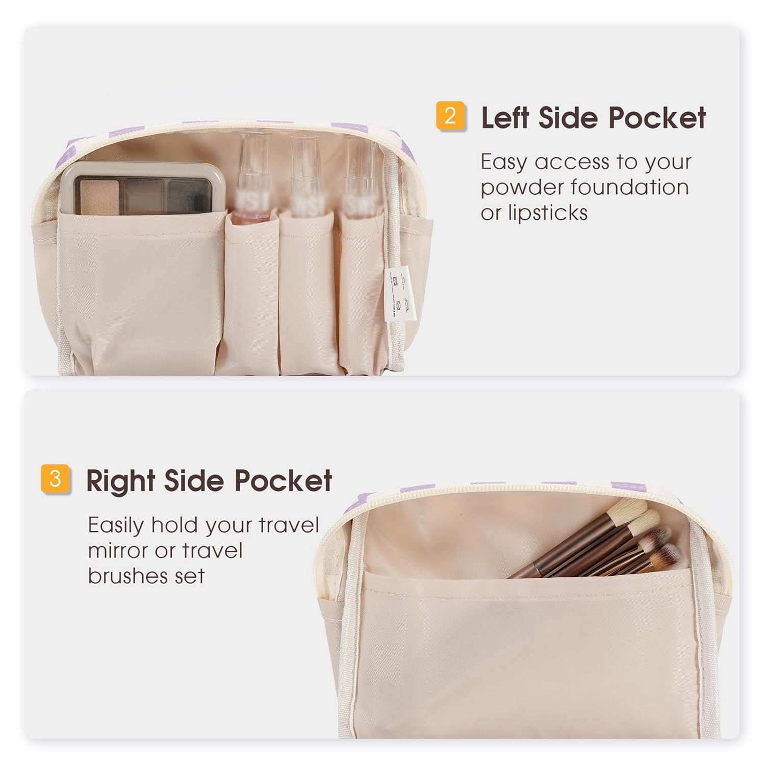 MULTIPLE STORAGE COMPARTMENTS – One main compartment with 5 small pockets neatly organizes your makeup. Main pocket in decent size holds many small items. Left side pockets hold your concealer or lipsticks, while right side easily holds your travel mirror or travel brushes set