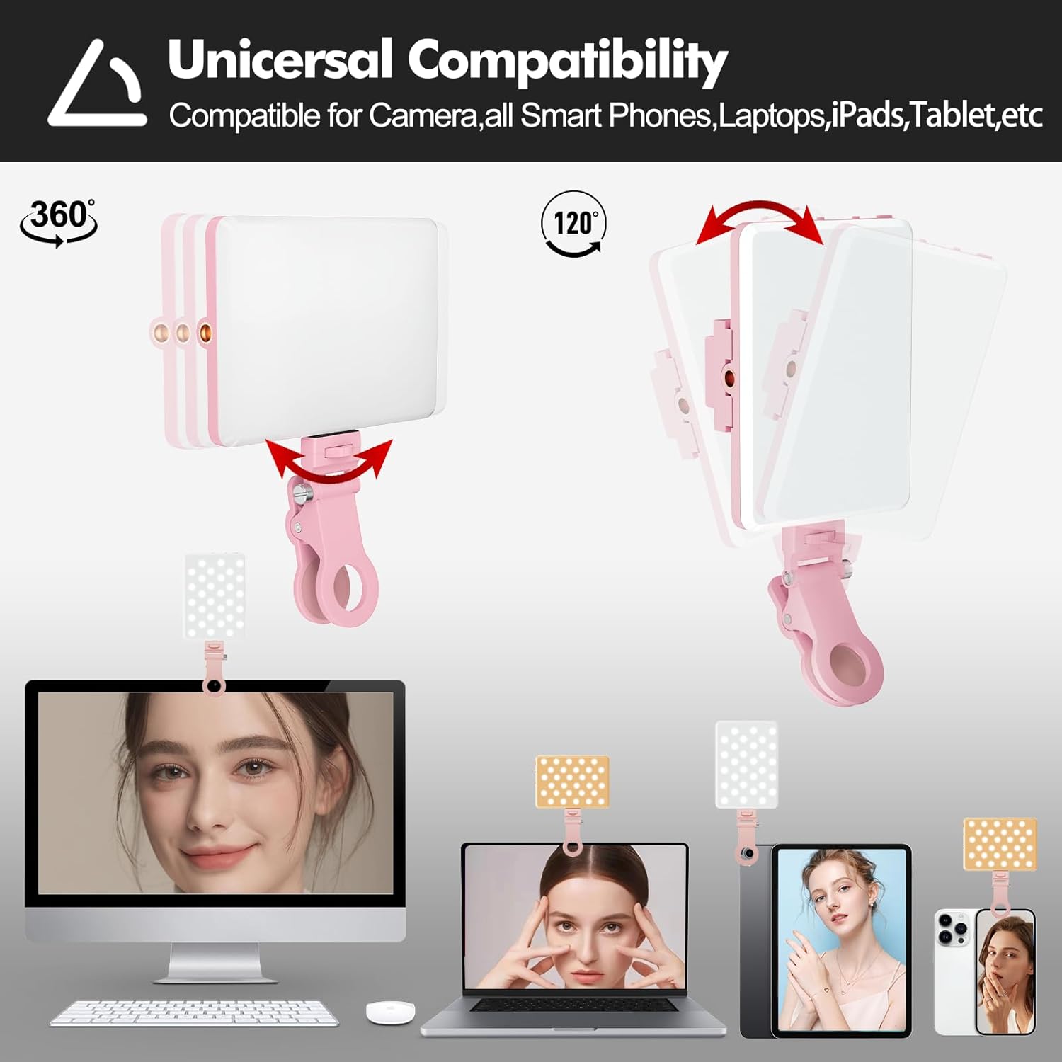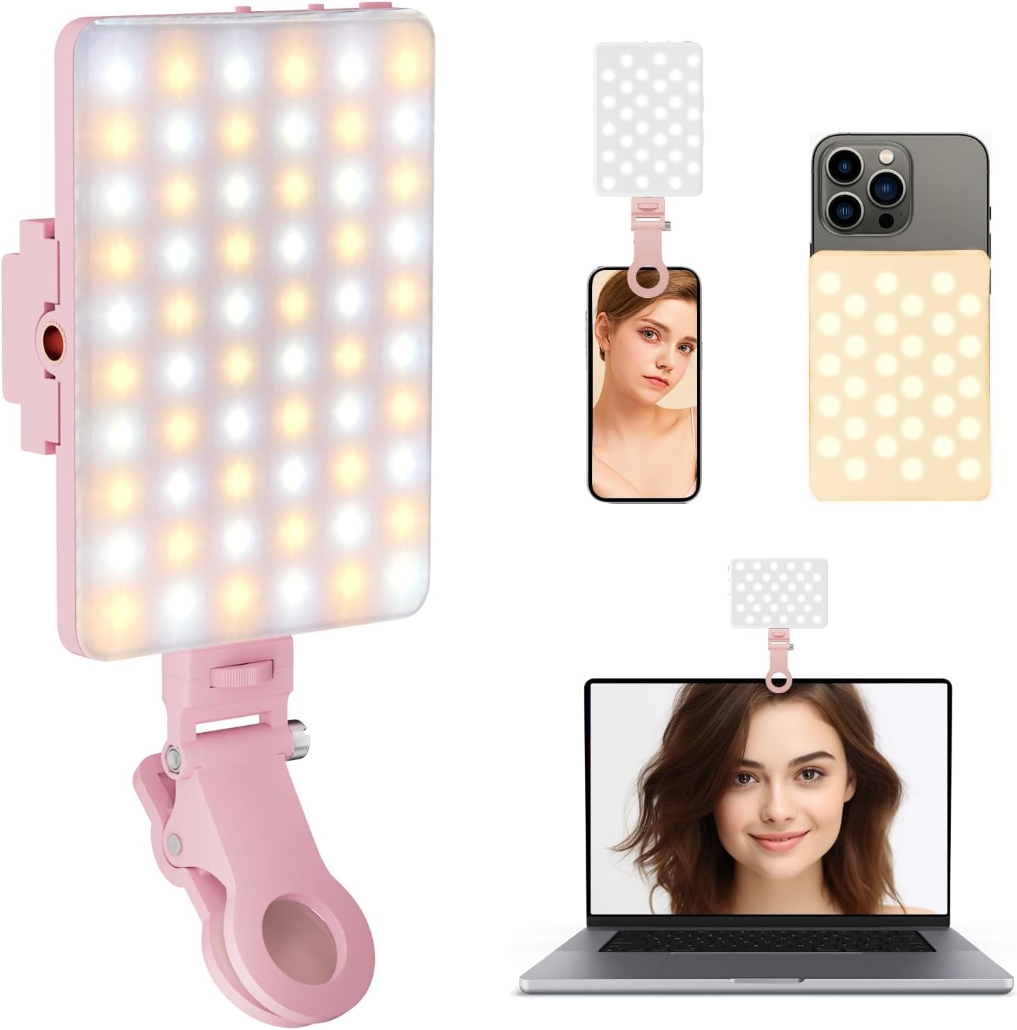 Pink Selfie Light, Phone Light Rechargeable with Front & Back Clip,60 LED Portable Cell Phone Fill Light with Adjusted 3 Light Modes for iPhone, Laptop, Camera, Makeup, Video Conference, TikTok