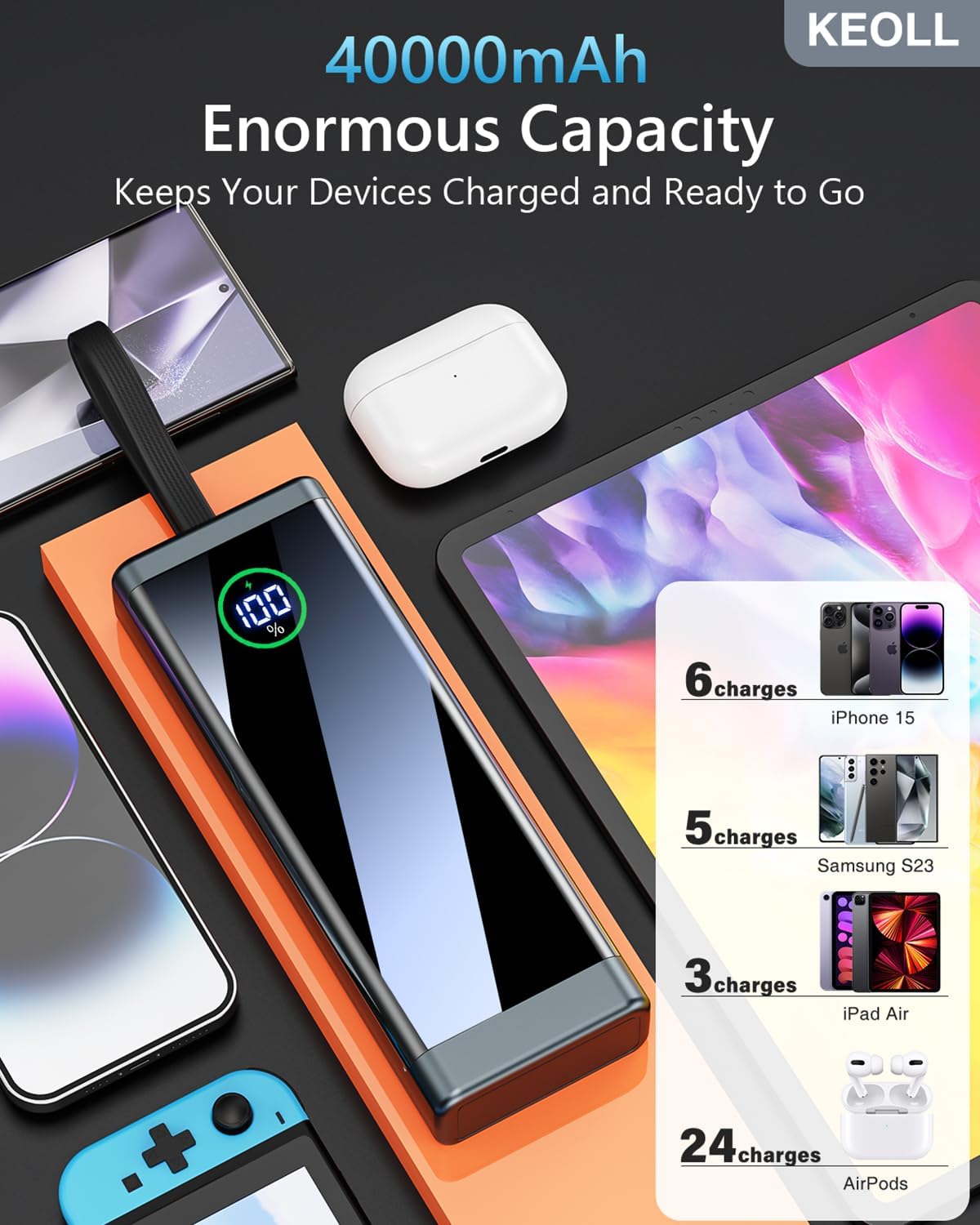 What You Get: KEOLL Portable Charger Power Bank (High Capacity of 40,000mAh, Built-in USB-C Cable, 22.5W Fast Charging/Recharging), User manual, mini USB-C cable; Always at your side: For any issues, reach out the KEOLL authorized store, our expert customer service team will respond promptly within 24 hours to answer questions and resolve any problems you may have with our portable charger.