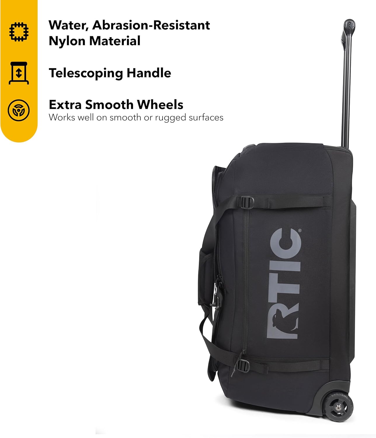 RTIC ROAD TRIP ROLLING Duffle BAG – Built for every adventure, featuring extra smooth rolling wheels, water-resistant fabric, and a telescoping handle for easy transport. Your ultimate travel companion for every adventure.