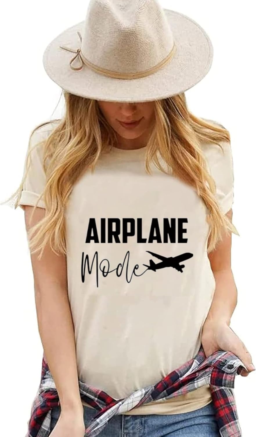 Women Airplane Mode Shirt Funny Letter Print Travel Tee Cute Graphic Summer Casual Short Sleeve Tee Tops