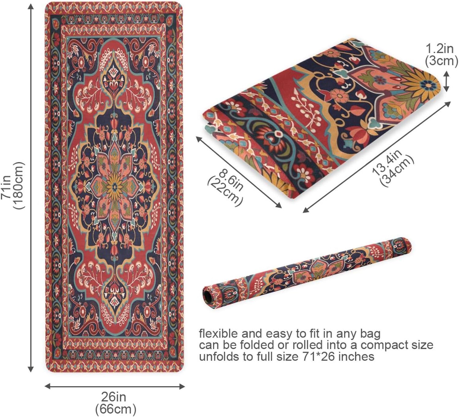 Yoga Mat Red Persian Design Fitness Mat Eco-Friendly Non Slip Portable Foldable Floor Workouts Mat for Pilates Home Gym Exercise Beach 70.8×26 inch